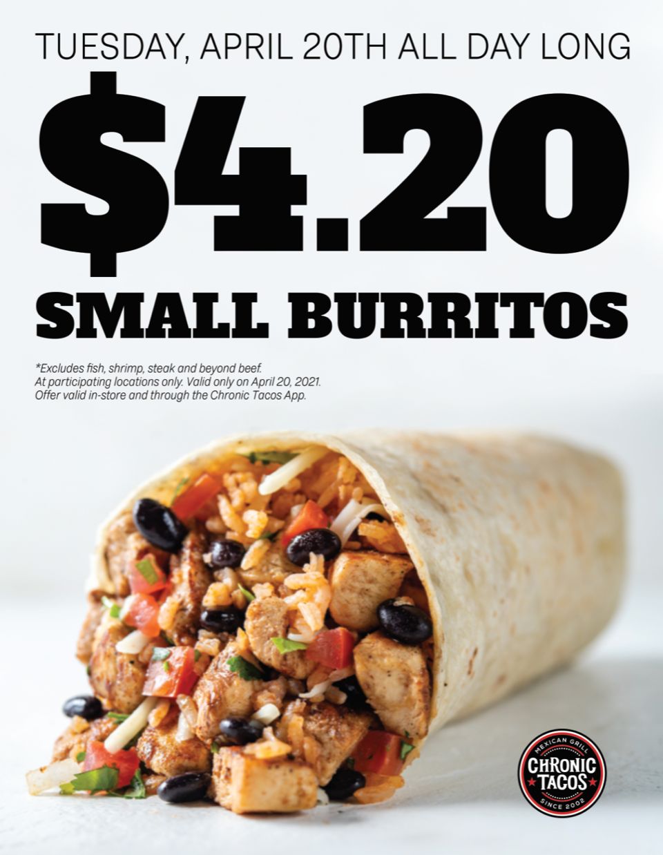 This special excludes fish, shrimp, steak and beyond beef. Guests can take advantage of this offer in store, on the Chronic Tacos app (https://apps.apple.com/us/app/chronic-tacos-mexican-grill/id1251640835), and through online ordering on the Chronic Tacos website (www.chronictacos.com).