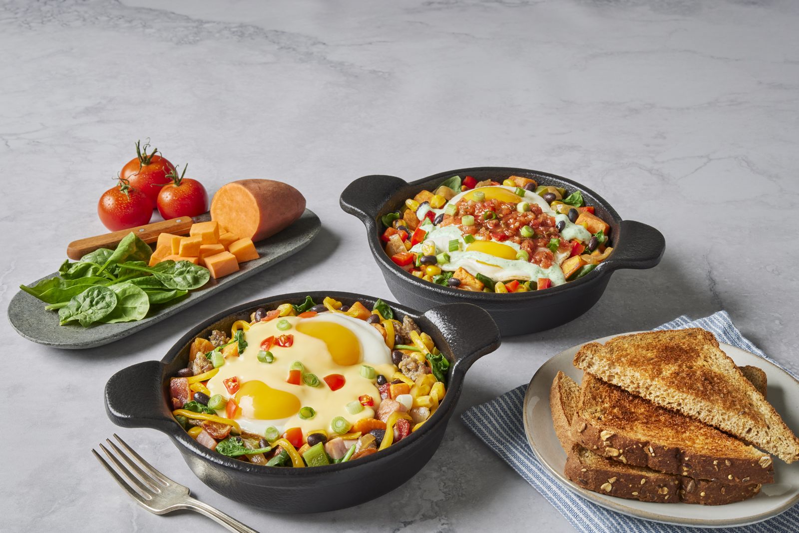 - New! Garden Veggie: Boasting 33g of protein, this bowl is filled with roasted sweet potatoes, sautéed spinach, diced peppers, roasted corn, black beans, caramelized onions, and topped with two eggs cooked your way, our new fresh salsa and our signature lime-cilantro cream sauce. Served with multigrain toast for $11.49*.