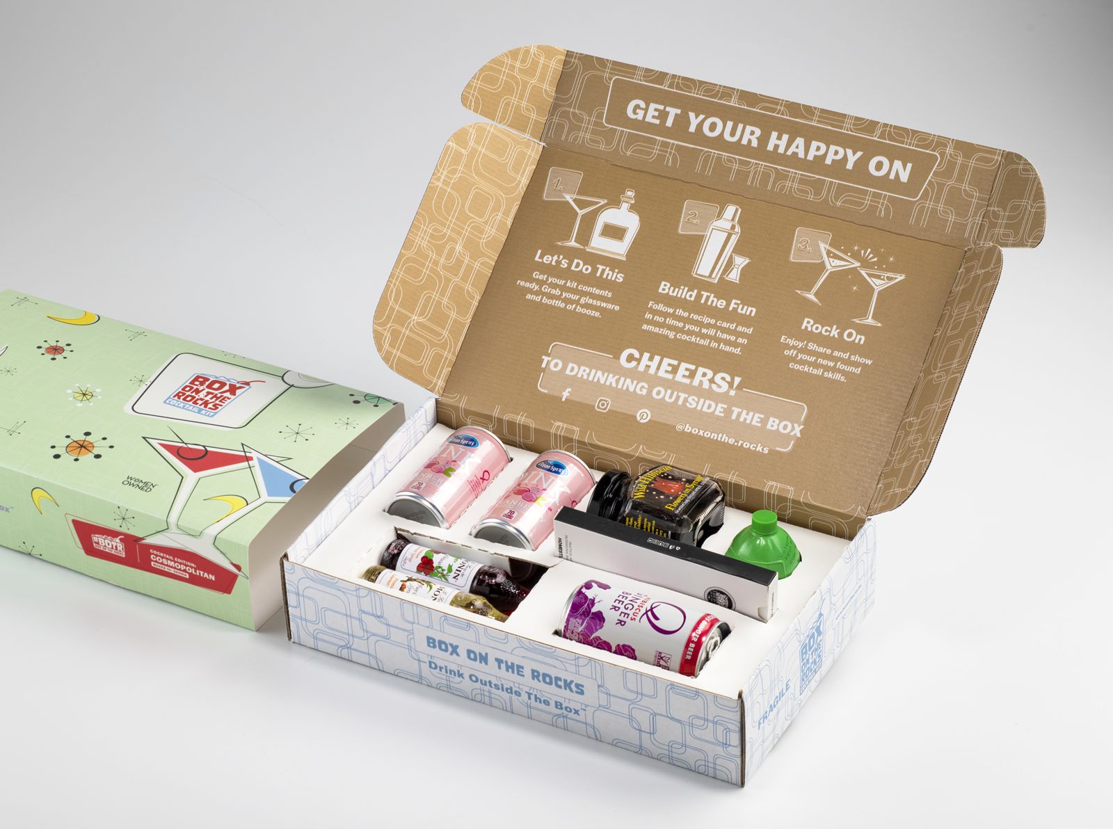 Box on the Rocks™ Cocktail Kits is a hip retro-inspired Cocktail Kit offering through eCommerce and trade. These kits are designed to make home bartending easy and fun. Our kits give consumers countless experiences, themed around multiple life occasions all in a single box. We are Cocktail experts so we know how to develop recipes that are unique but easy to make and even more – are delicious.