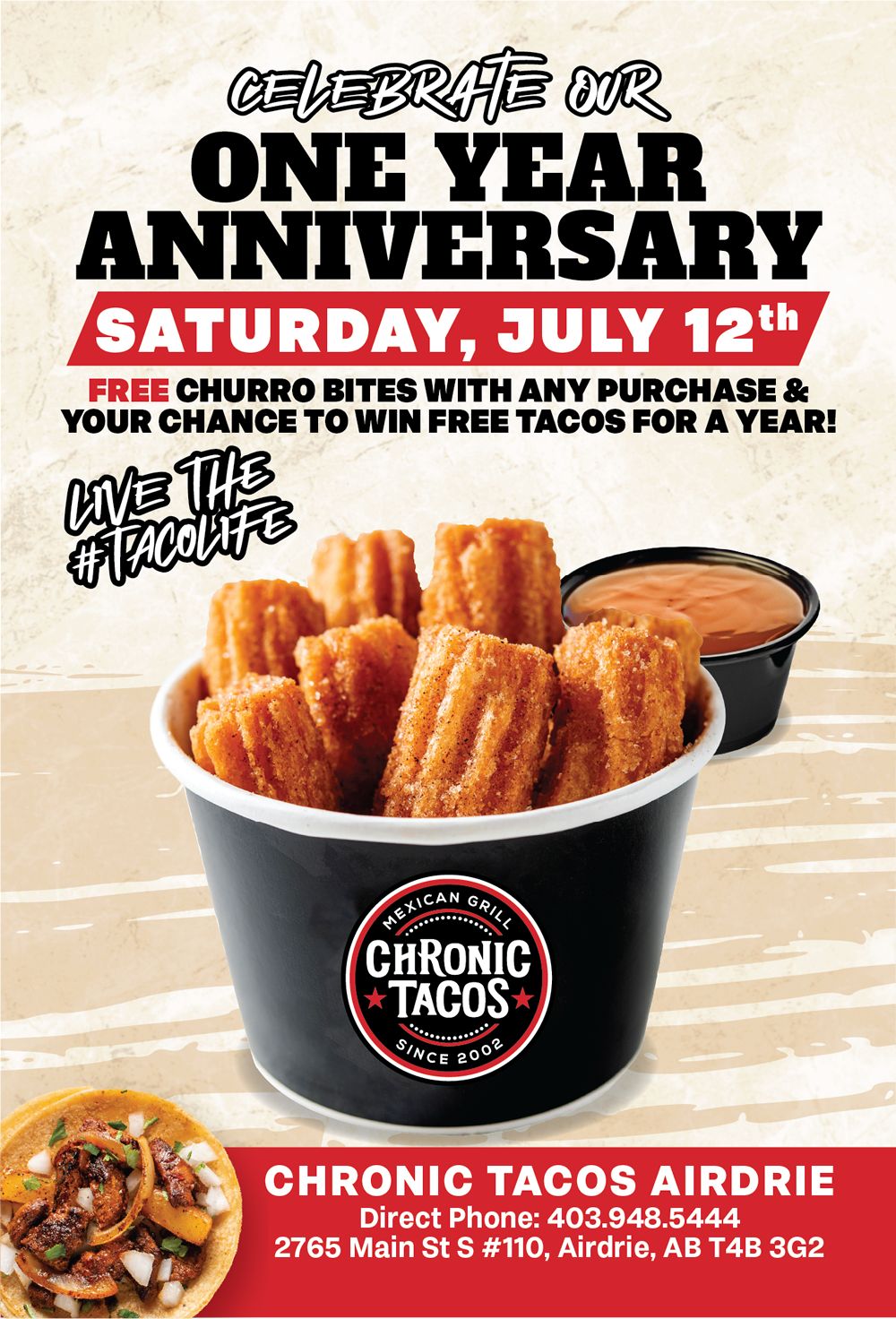 Chronic Tacos Airdrie Location Celebrates One-Year Anniversary with Free Churro Bites and a Chance to Win Free Tacos for a YearAirdrie, AB  (Restaurant News ReleaseChronic Tacos Airdrie is thrilled to celebrate its one-year anniversary on Saturday, July 12, and invites the community to join the party with free churro bites with any purchase and the chance to win free tacos for a year.