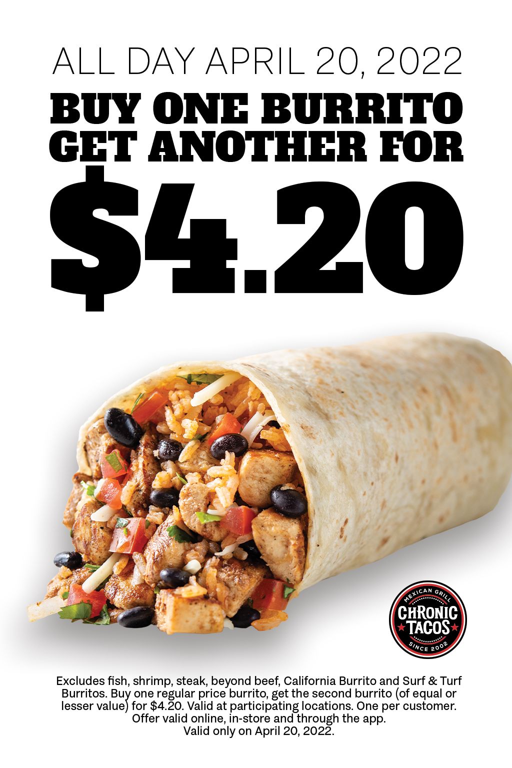 In honor of the holiday for people that crave the “chronic,” Chronic Tacos, California-inspired Taco Shop will be offering a buy one burrito or bowl-rito at regular price, get the second for $4.20 (offer excludes Fish, Shrimp, Steak, Surf & Turf burritos, Beyond Beef and Cali Burritos). Mexican food lovers will be left feeling full with delicious and fresh food for the Celebration of Munchies.