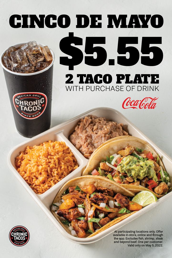 Chronic Tacos, California-inspired Taco Shop is excited to announce they are offering a 2 Taco plate for $5.55 with the purchase of a regular fountain drink (offer excludes Fish, Shrimp, Steak, and Beyond Beef). Celebrating their Mexican roots, these deals will be available both for in-store and online ordering. All Canadian locations will be offering this promotion for $8 and in Hawaii it be will $10.55.
