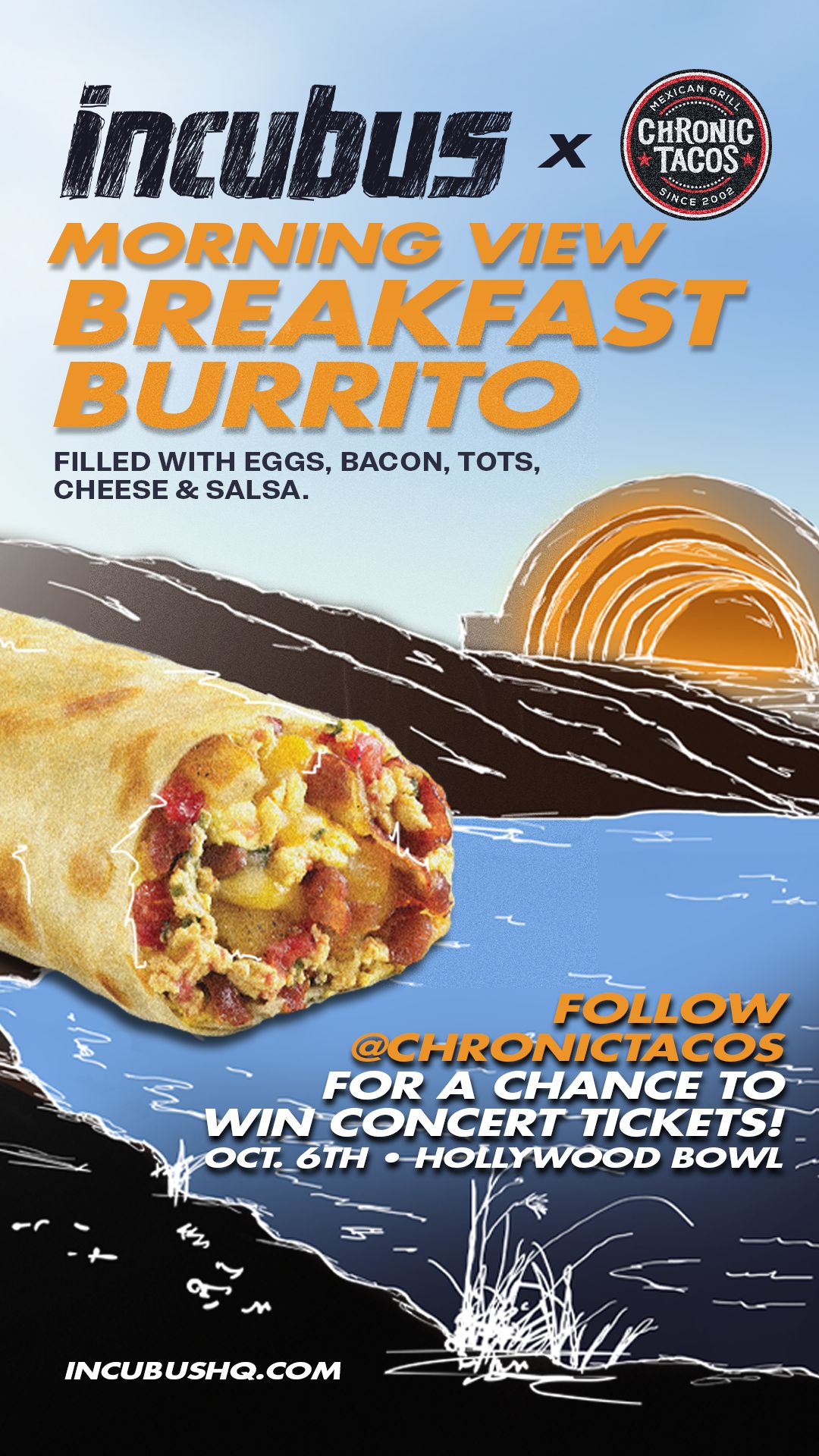 Don’t miss out on the chance to be a part of history as Chronic Tacos and Incubus come together to create a night to remember at the Hollywood Bowl. Follow Chronic Tacos on Instagram @chronictacos and enter the contest between September 1st and September 15th for your opportunity to win two tickets to this once-in-a-lifetime event.