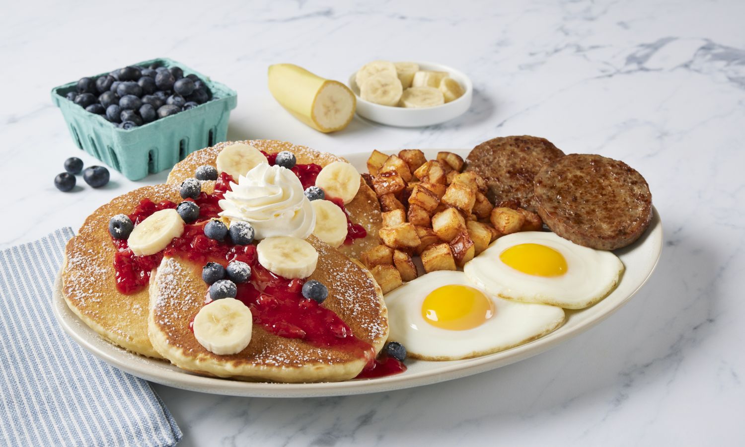 - NEW! Red, White & Blueberry Farmer’s Choice: Three buttermilk hotcakes or two slices of thick-cut brioche French toast topped with strawberry sauce, blueberries, bananas, powdered sugar, and whipped topping. Includes your choice of breakfast meat and two eggs. Also served with hash browns, home fries, or fresh-cut fruit.