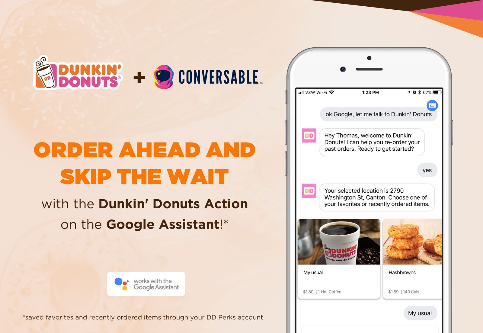 DD Perks® Rewards members can use the Google Assistant on iPhones and Android phones to place a mobile order and then speed pass the line in store for pick-up