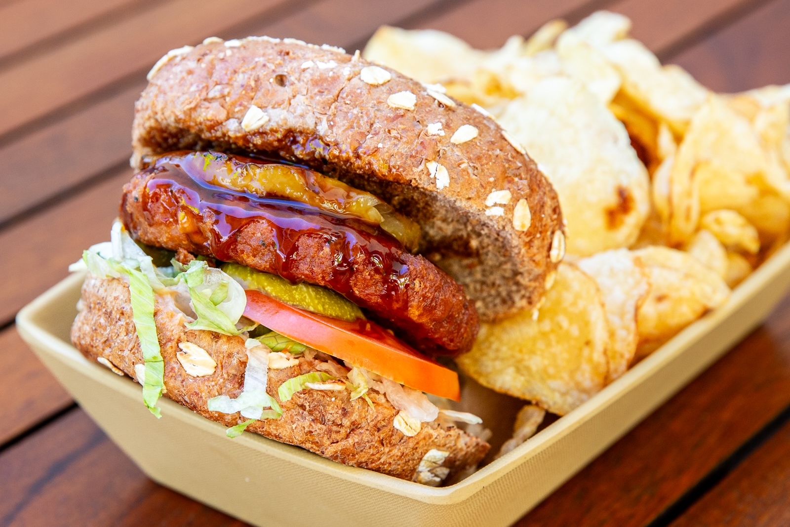 - Teriyaki Salmon Burger – Plant-based salmon patty, teriyaki glaze, pineapple, lettuce and tomato on oat roll with chips