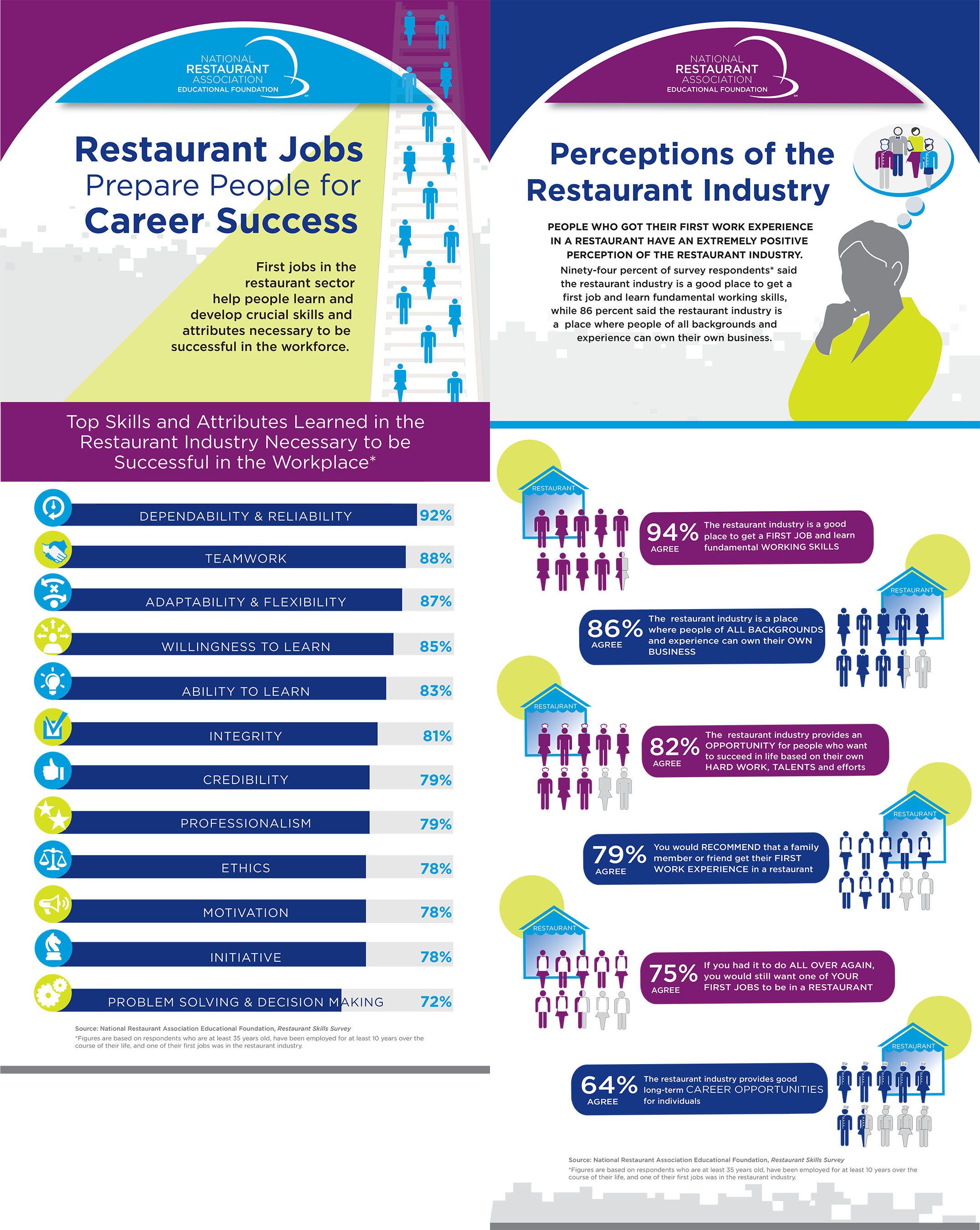The Who Works in the U.S. Restaurant Industry report by the National Restaurant Association Educational Foundation shows that first jobs in the restaurant sector help people learn and develop crucial skills and attributes necessary to be successful in the workforce – regardless of industry.