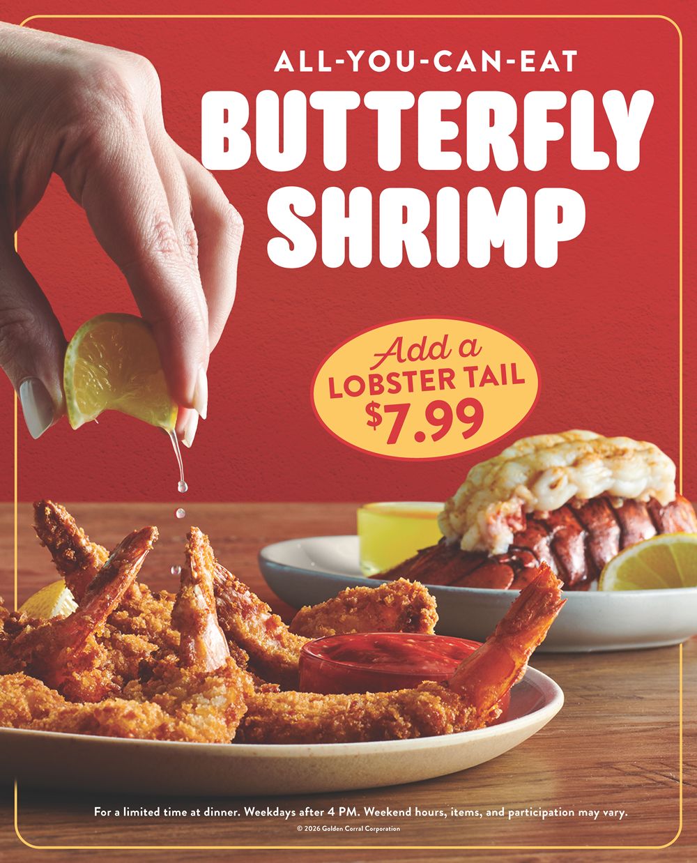 The All-You-Can-Eat Butterfly Shrimp & Steak and the $7.99 Lobster Tail add-on offering is available for dinner on weekdays after 4 p.m. Weekend hours, item availability, and participation may vary. Guests are encouraged to visit their local Golden Corral to enjoy endless Sirloin Steak, Butterfly Shrimp, and a variety of new seafood favorites before the promotion ends on April 19.
