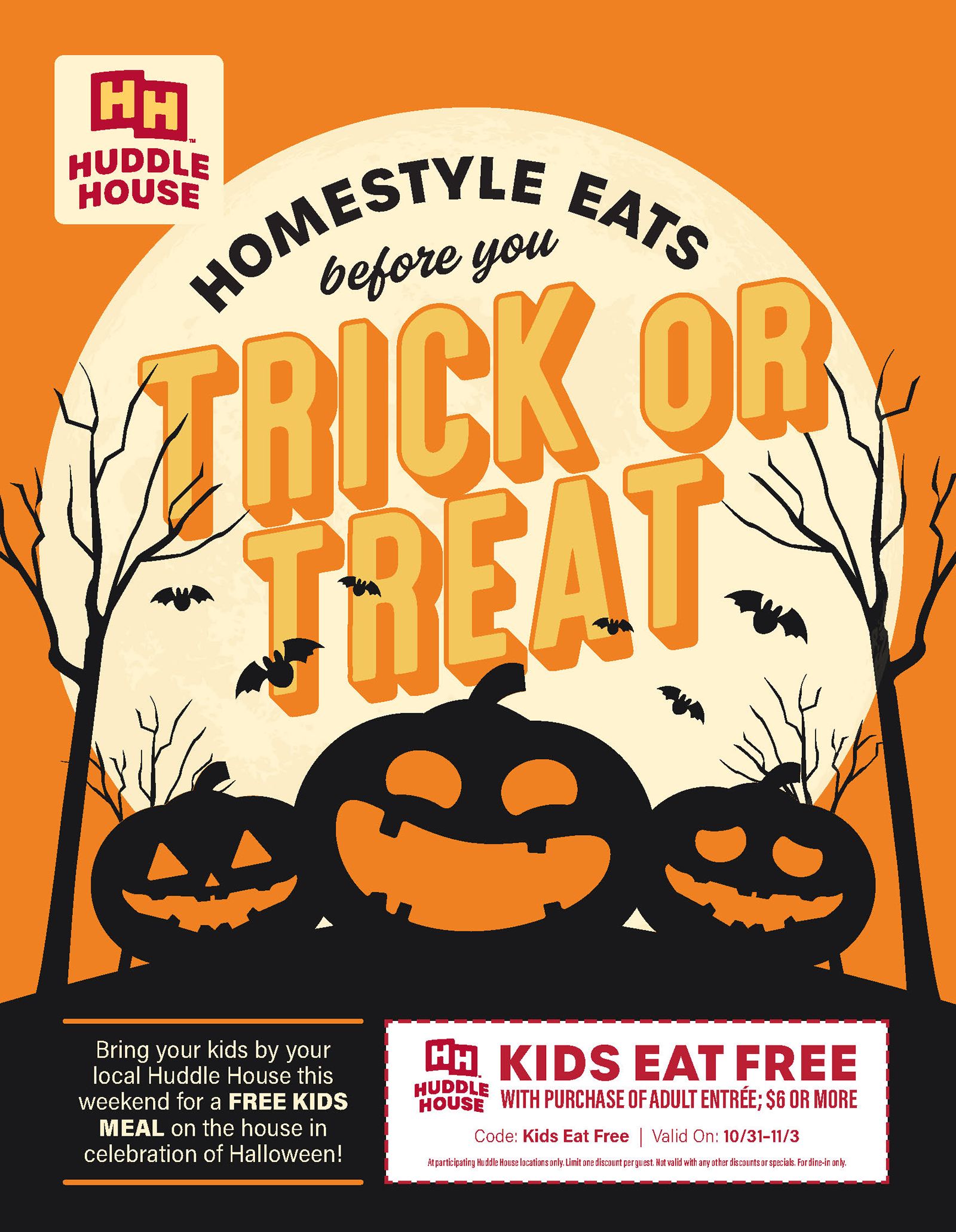 Atlanta, GA (Restaurant News Release) Huddle House is brewing up more treats than tricks with the return of Huddleween! The beloved family-dining brand, known for serving freshly prepared, home-style meals since 1964, invites families to get into the Halloween spirit and enjoy a festive meal where their little ones can feast like werewolves. From Thursday, October 31st to Sunday, November 3rd, guests can enjoy a Free Kids Meal with the purchase of any adult entrée priced at $6 or more.