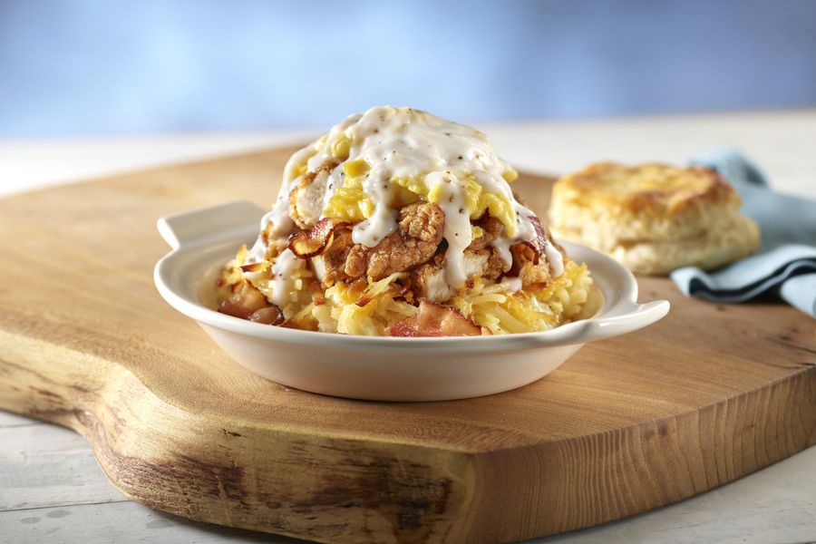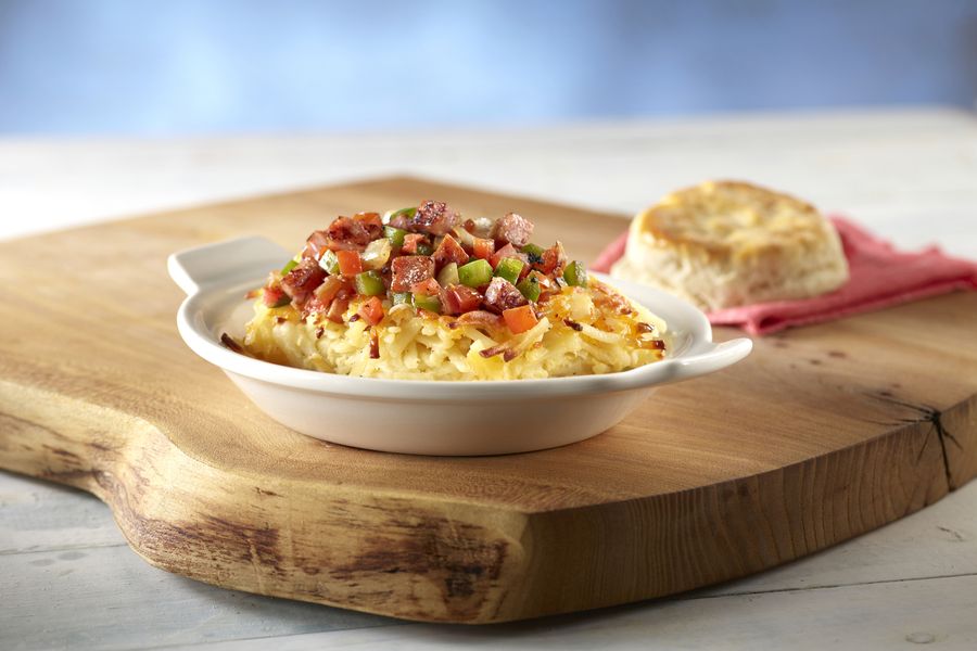 • Sausage & Bacon Hashbrown Casserole: This perfectly seasoned signature cheesy Hashbrown Casserole is topped with country sausage, farm fresh scrambled eggs, Applewood smoked bacon, and sausage gravy. Served with a fluffy biscuit for only $8.99.