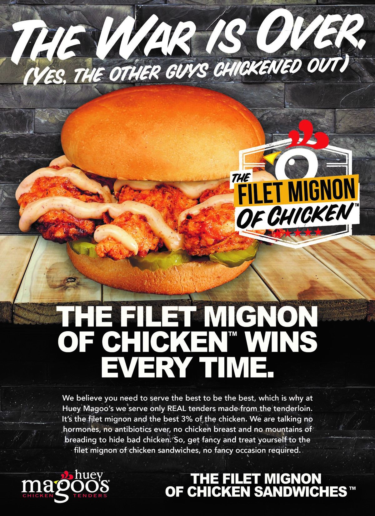 Orlando, FL (Restaurant News Release) As the race continues in the ongoing chicken sandwich wars, America’s greatest tasting, rapidly expanding chicken tenders restaurant Huey Magoo’s is declaring “No Contest” and going on the record as the superior chicken tenders brand and the “Filet Mignon Of Chicken™”. Using only real tenders made from the tenderloin, the best 3% of the chicken, in all their fresh and delicious tender meals, salads sandwiches and wraps, Huey Magoo’s is rightfully asserting this claim, and here’s how: