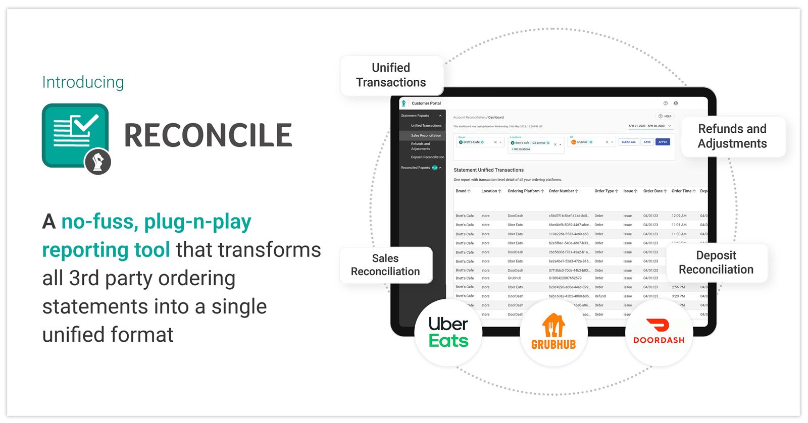 Reconcile works inside any accounting process to reduce the hours spent on repetitive tasks to assemble 3rd party ordering platform revenue reports