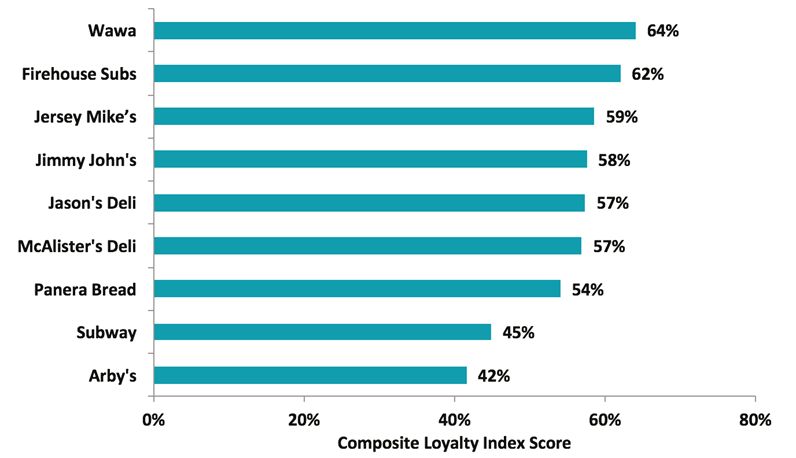 Wawa is a 54-year-old chain with more than 790 convenience retail stores on the East Coast. It offers fresh food selections such as custom-prepared hoagies, freshly brewed coffee, hot breakfast sandwiches, specialty beverages and an assortment of soups and sides. Wawa rose four places to unseat the 2017 sandwich category winner, Firehouse Subs, which slipped 15 percentage points to land in second place this year. Jersey Mike’s was third, followed by Jimmy John’s, Jason’s Deli and McAlister’s Deli [See Graph 3].