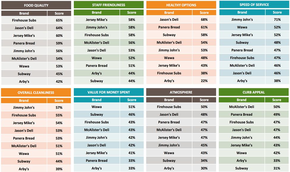 No single brand dominated across the eight customer experience attributes that Market Force studied, though Firehouse Subs took the top spot in two – food quality and atmosphere – and tied with Jersey Mike’s and Jimmy John’s for staff friendliness. Jason’s Deli came out on top for healthy options, while Jimmy John’s ranked highest for speed of service and overall cleanliness. Wawa was again No. 1 for value, five percentage points ahead of second place Subway. Arby’s was last in nearly all of the categories. [See Graph 4].