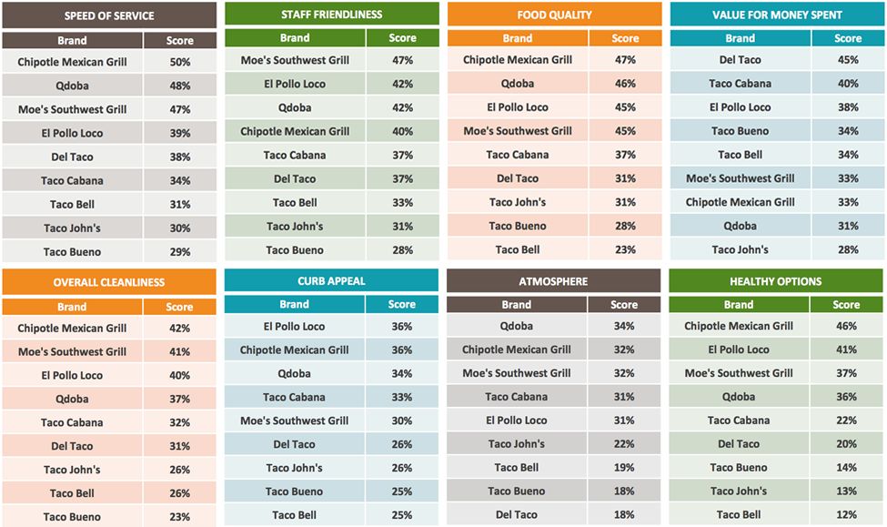 Chipotle earned the top spot for many customer experience categories, including food quality, service speed, healthy options and cleanliness. It also tied with El Pollo for curb appeal. Del Taco was the value leader, while Moe’s Southwest Grill was found to have the friendliest staff, and Qdoba the best atmosphere. Taco Bell, Taco John’s and Taco Bueno ranked toward the bottom in most categories. [See Graph 6.]