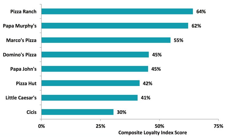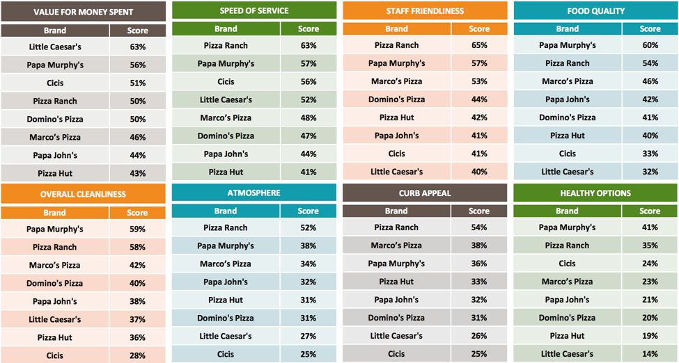 Pizza Ranch and Papa Murphy’s led in every customer experience category except value, which went to Little Caesar’s. Papa Murphy’s was No. 1 for food quality, healthy options and cleanliness, while Pizza Ranch was a clear winner in atmosphere and curb appeal and was also found to have the friendliest staff and fastest service speed, best atmosphere and curb appeal. Marco’s Pizza also performed well, landing in the top three in five key categories. [See Graph 8].