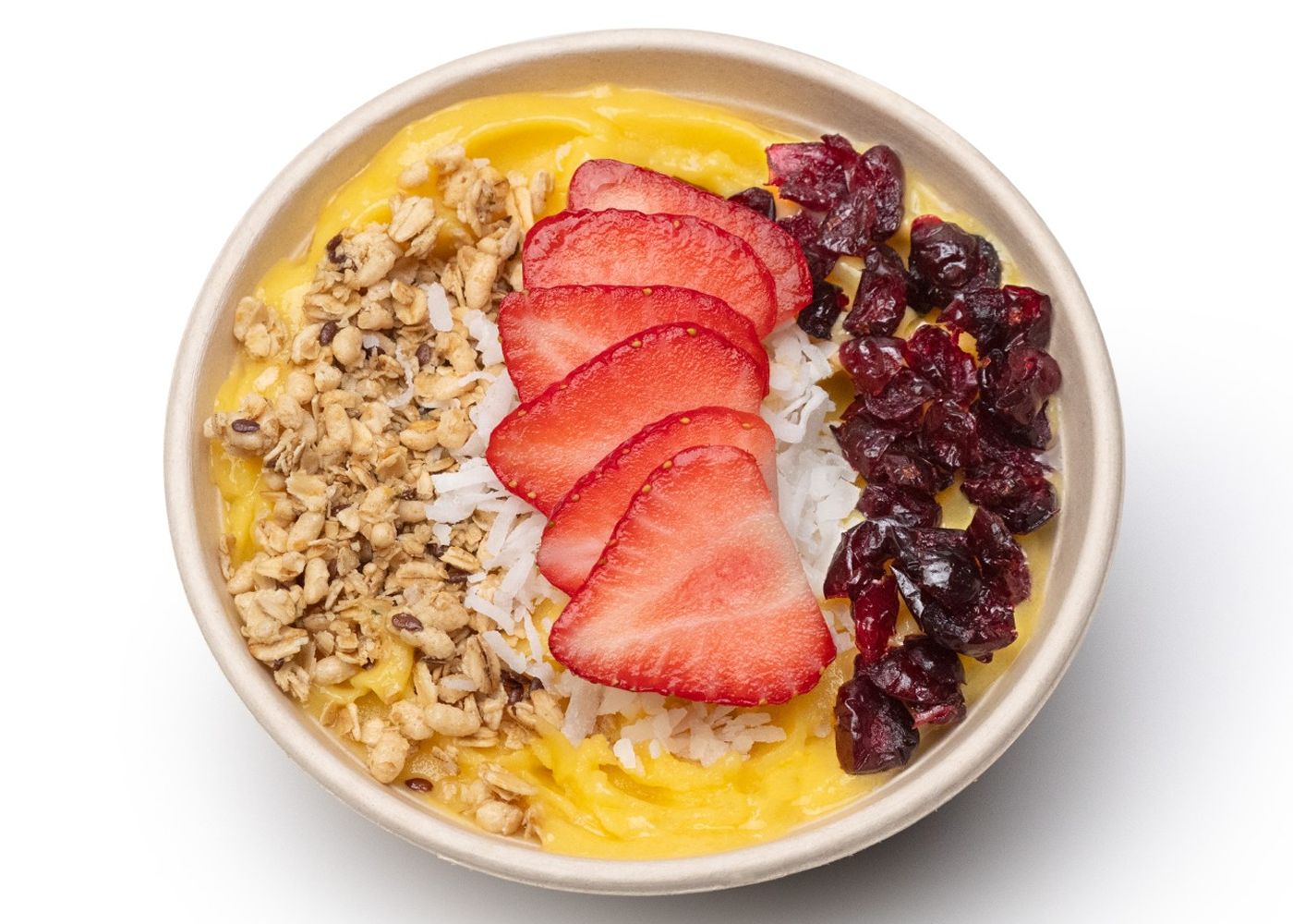 Mango Magic – A tropical burst of sunshine featuring papaya juice, mango, frozen yogurt, and pineapple sherbet, finished with coconut, granola, cranberries, and fresh strawberries for a vibrant, island-inspired bite.