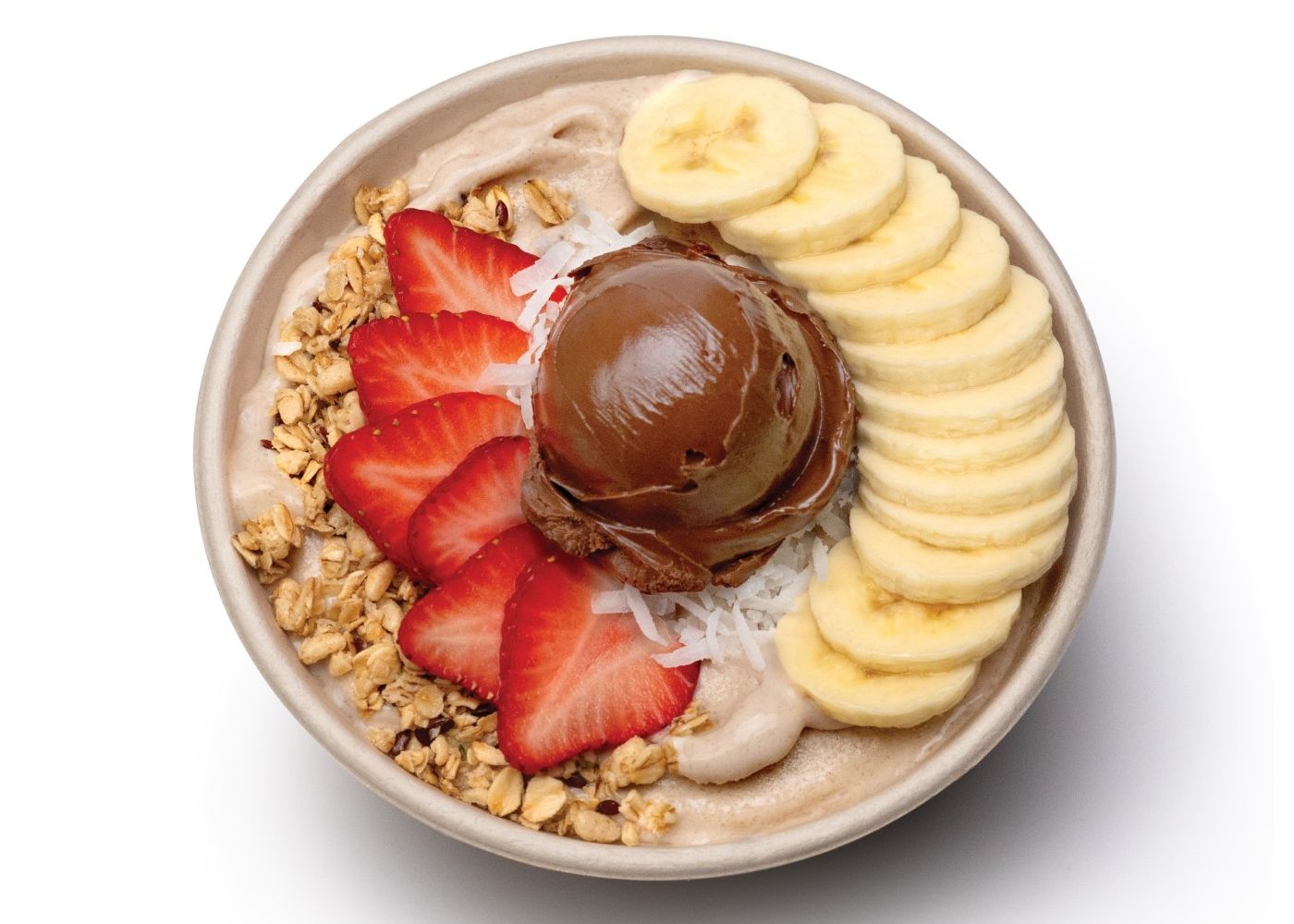 Nutty Banana Crunch with Nutella® – A decadent base containing frozen yogurt, banana, and peanut butter finished with fresh strawberries and bananas, coconut, granola, and a generous scoop of Nutella® for the ultimate crunchy-creamy indulgence.