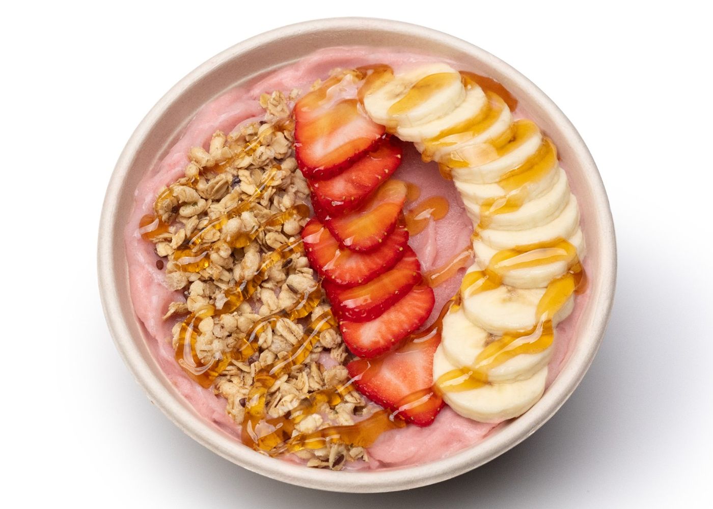 Strawnana Berry Blast – A comforting classic with a fresh twist, made with apple juice, strawberries, bananas, and frozen yogurt, then topped with fresh banana, granola, strawberries, and a drizzle of honey for the perfect balance of sweetness.