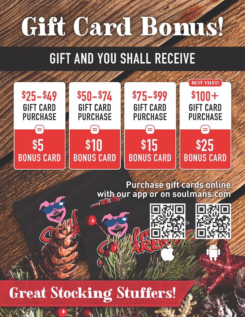 For the holidays, Soulman’s is offering bonuses on gift card purchases in graduating amounts. For gift cards amounts of $25-$49, purchasers will receive a $5 bonus card. For gift cards of $50-$74, purchasers will receive a $10 bonus card. For gift cards of $75-$99, purchasers will receive a $15 bonus card. For gift cards over $100, purchasers will receive a $25 bonus card. This offer is valid from now to December 31, 2023, at all 19 North Texas Soulman’s Bar-B-Que locations, in the Soulman’s Bar-B-Que app, or at https://soulmans.com/gift-cards/.