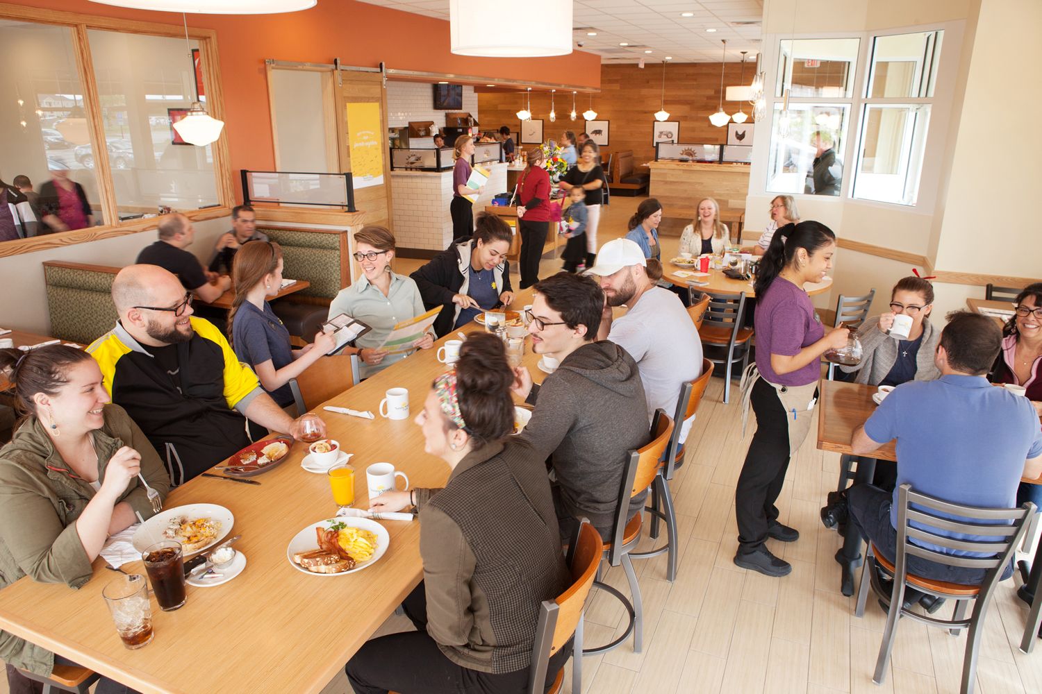The restaurant offers the same delicious menu of all day breakfast and lunch, as well as full service catering for surrounding businesses. The design of the store represents a new layout and decor package throughout the interior. It also features a private dining room with A/V presentation capabilities, and a community table for opening seating.
