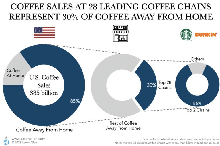 The United States coffee industry reaches $85 billion in annual sales — 20% of the global coffee market. The coffee shop industry is the third largest restaurant category in the U.S., with 11% of sales among the largest 200 chains and growing significantly faster than the two leading categories (LSR Burger and Full-Service Restaurants).