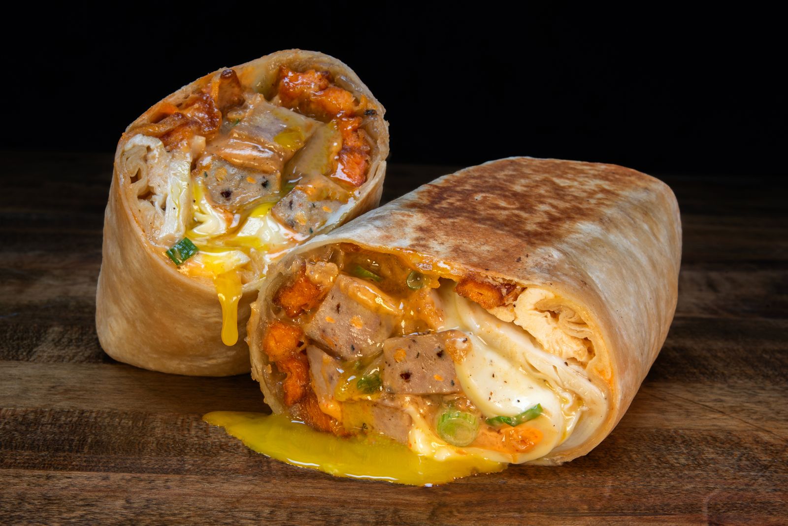 Breakfast Way – with three sunny-side-up eggs, American cheese, caramelized onions, crispy fried onions, sweet potato fries, spicy mayo, turkey gravy and scallions; wrapped burrito-style in a grilled flour tortilla