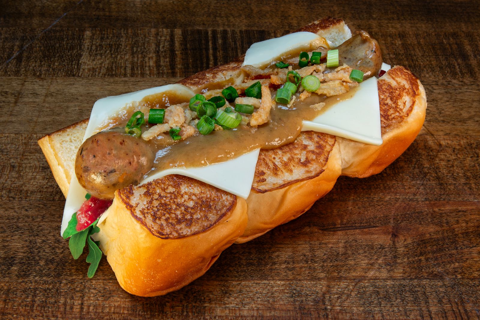Würst Way – with American cheese, arugula, cranberry aioli, turkey gravy, crispy onions and scallions; served on grilled King’s Hawaiian rolls